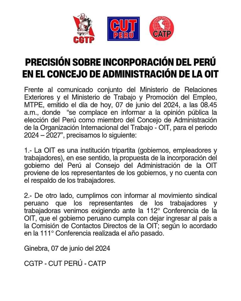 PRECISIÓN SOBRE LA INCORPORACIÓN DEL PERÚ EN EL CONSEJO ADMINISTRATIVO DE LA OIT