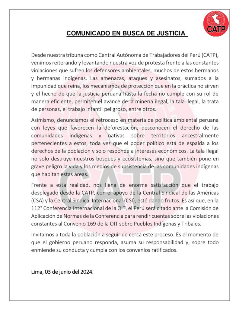 DENUNCIAMOS VIOLACIONES CONTRA LOS DERECHOS DE DEFENSORES AMBIENTALES E INDÍGENAS